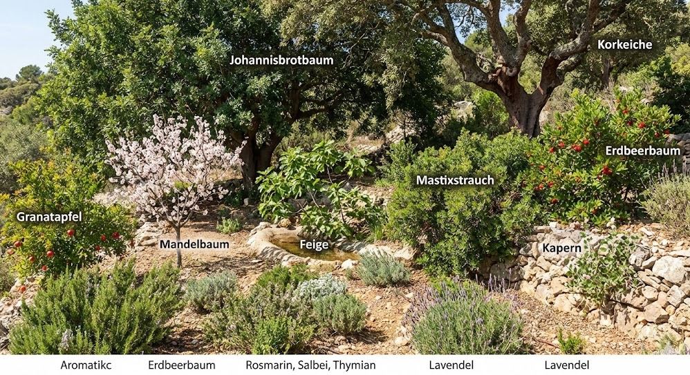 Hier ist der Einkaufs-Guide für dein mediterranes Waldgarten-Projekt (Sardinien-Fokus).