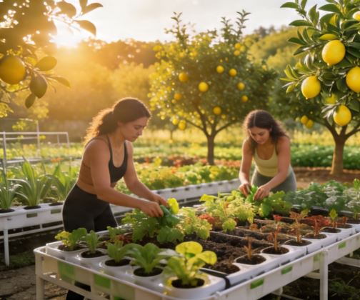 - Food-Production: Anlegen von Permakultur-Beeten, Aufbau der Hydroponik-Systeme und intelligentes Wasser-Management, um das Land fruchtbar zu machen.