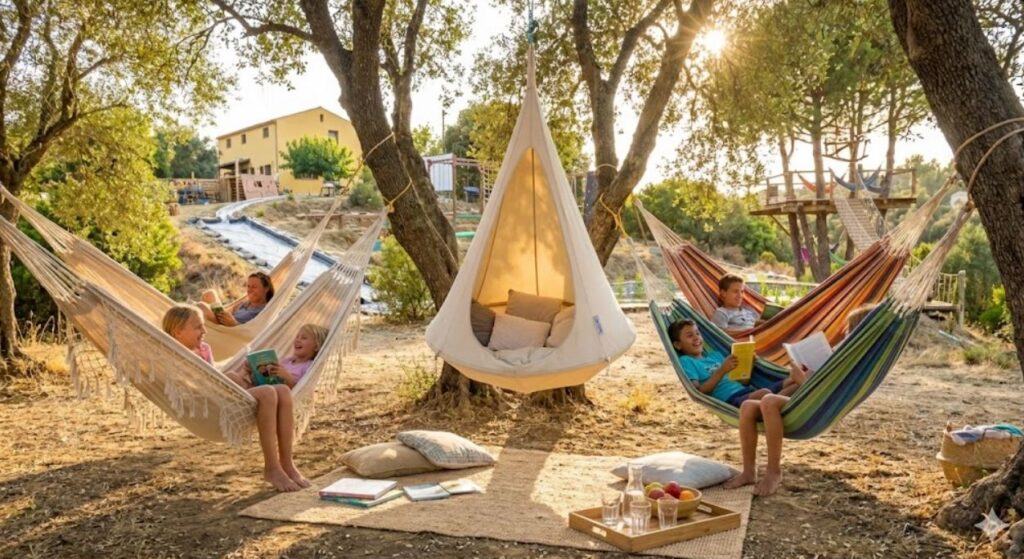 - Action: Baumschaukeln, Slackline & Barfußpfad.