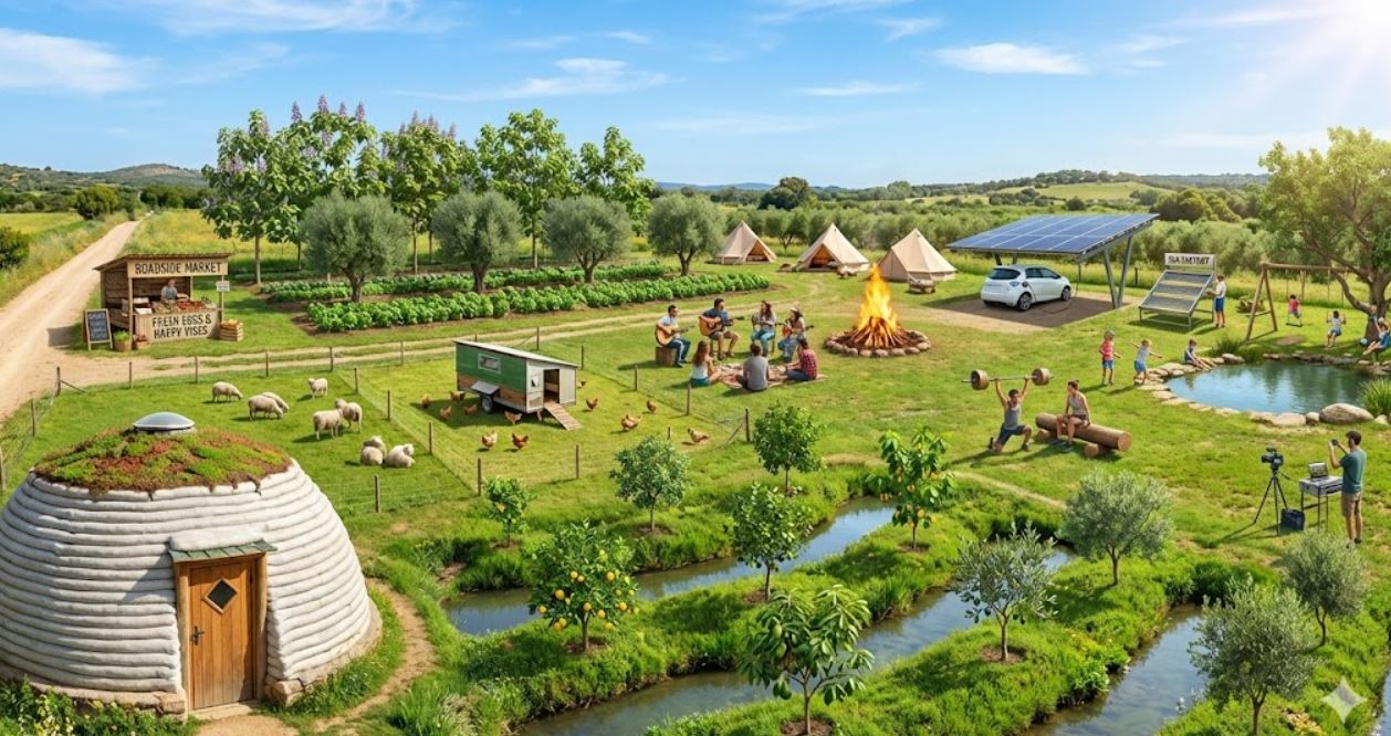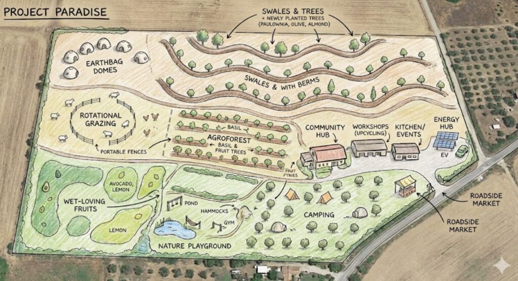 Ziel: Wasser fangen (Swales), Bäume pflanzen (bevor die Hitze kommt). Zeitfenster: Februar/März!