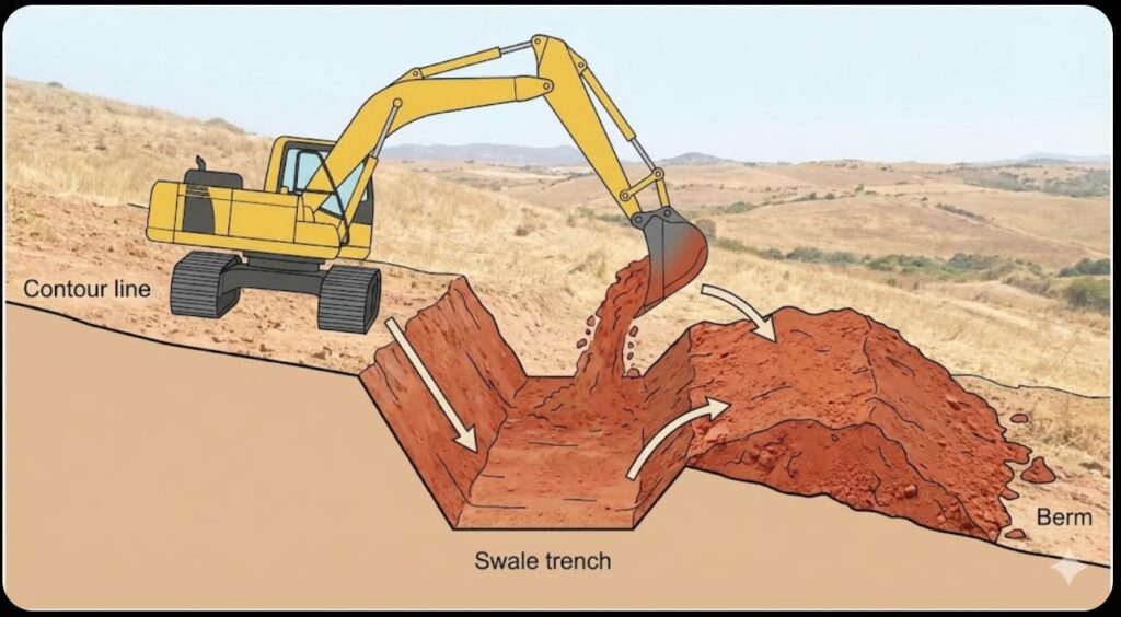 Hier ist die detaillierte Anleitung, wie ihr das Prinzip „Stop, Spread, Sink“ (Stoppen, Verteilen, Versickern) mit dem Bagger umsetzt.